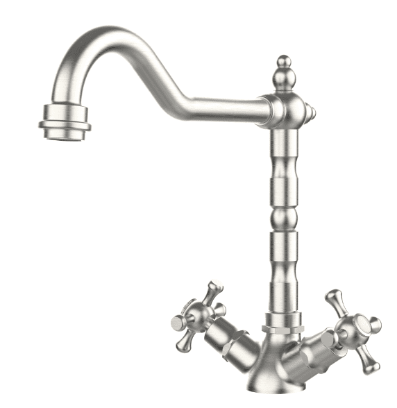 Sapphire twin lever quarter turn swan neck tap in brushed steel. We can fit this tap for you.